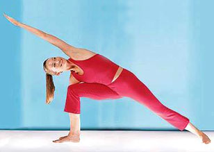 保持这个姿势深呼吸五次。然后用手放松的支撑在地板上,收回右腿,用一套串联式瑜伽动作放松(四柱式-上犬式-下犬式),之后在继续左侧的动作。